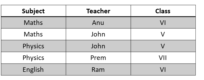 In the above table, John takes both Maths and Physics for class V. Suppose we add a new class as IX but do not know about the subjects and teachers. But all three columns together act as a primary key, so, we leave the other two columns blank. So to make it is in 5NF, we can decompose it into three relations as follows: